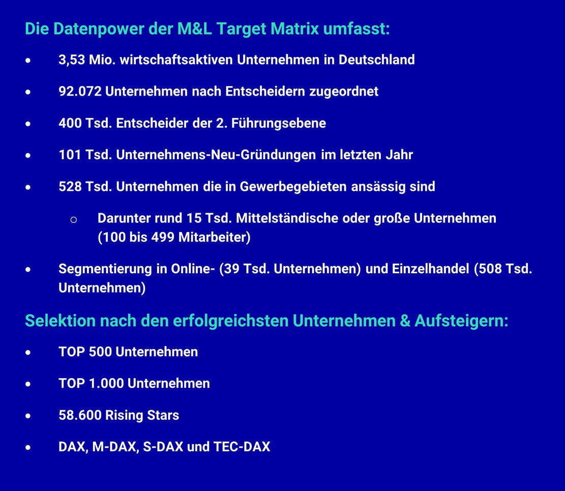 Mit der M&L Target Matrix steht Ihnen eine ständig aktualisierte Datenbasis mit rund 3,75 Mio. wirtschaftsaktiven Unternehmen in Deutschland zur Verfügung. Wir helfen und begleiten Sie dabei, daraus das für Sie relevante und adressierbare Potenzial zu selektieren und zu nutzen.