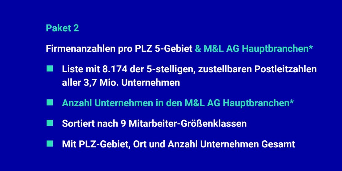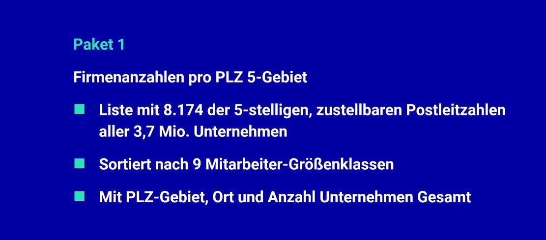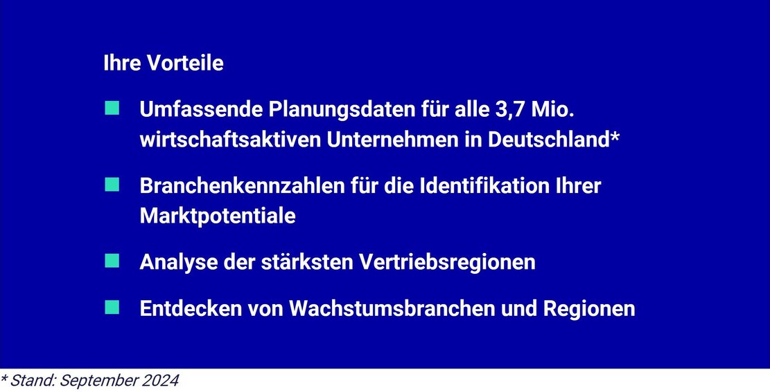 Mit unseren ready-to-use Datenpaketen für die zielgerichtete Unternehmens- und Vertriebsplanung.