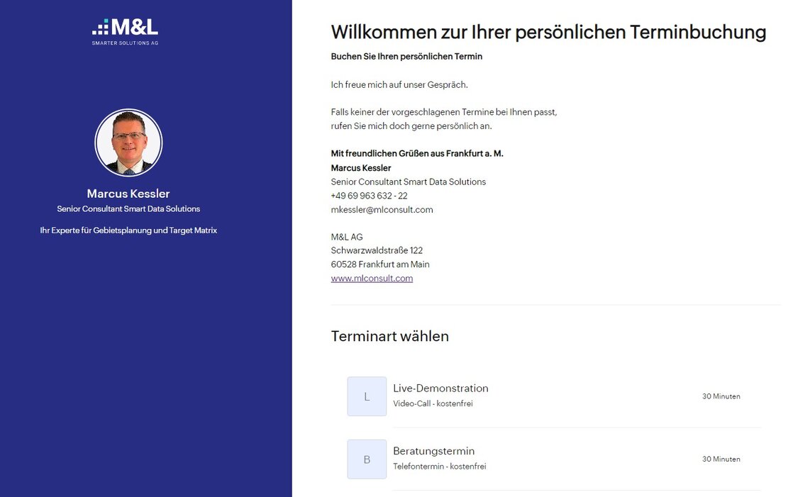 Buchen Sie jetzt Ihren persönlichenTermin und überzeugen Sie sich in einer Live-Demonstration von der Funktionsweise unserer Lösung zur Vertriebsoptimierung. Profitieren Sie sofort von der für Sie passenden Auswertungung Ihrer Marktdaten. Erhalten Sie im Anschluss an den Termin ein erstes Kurz-Reporting mit Ihren persönlichen Target Matrix Ergebnissen für Ihre Vertriebsoptmierung – unverbindlich und kostenlos.